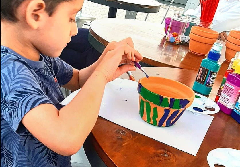 Nadat de verf is opgedroogd vul je het met potaarde. Hele kleine zaadjes druk je in de aarde. Het water geven en op een zonnige warme plek moet thuis gebeuren. Want natuurlijk neem je je eigen bloempotje mee naar huis!